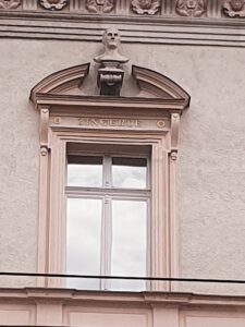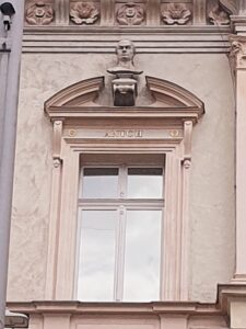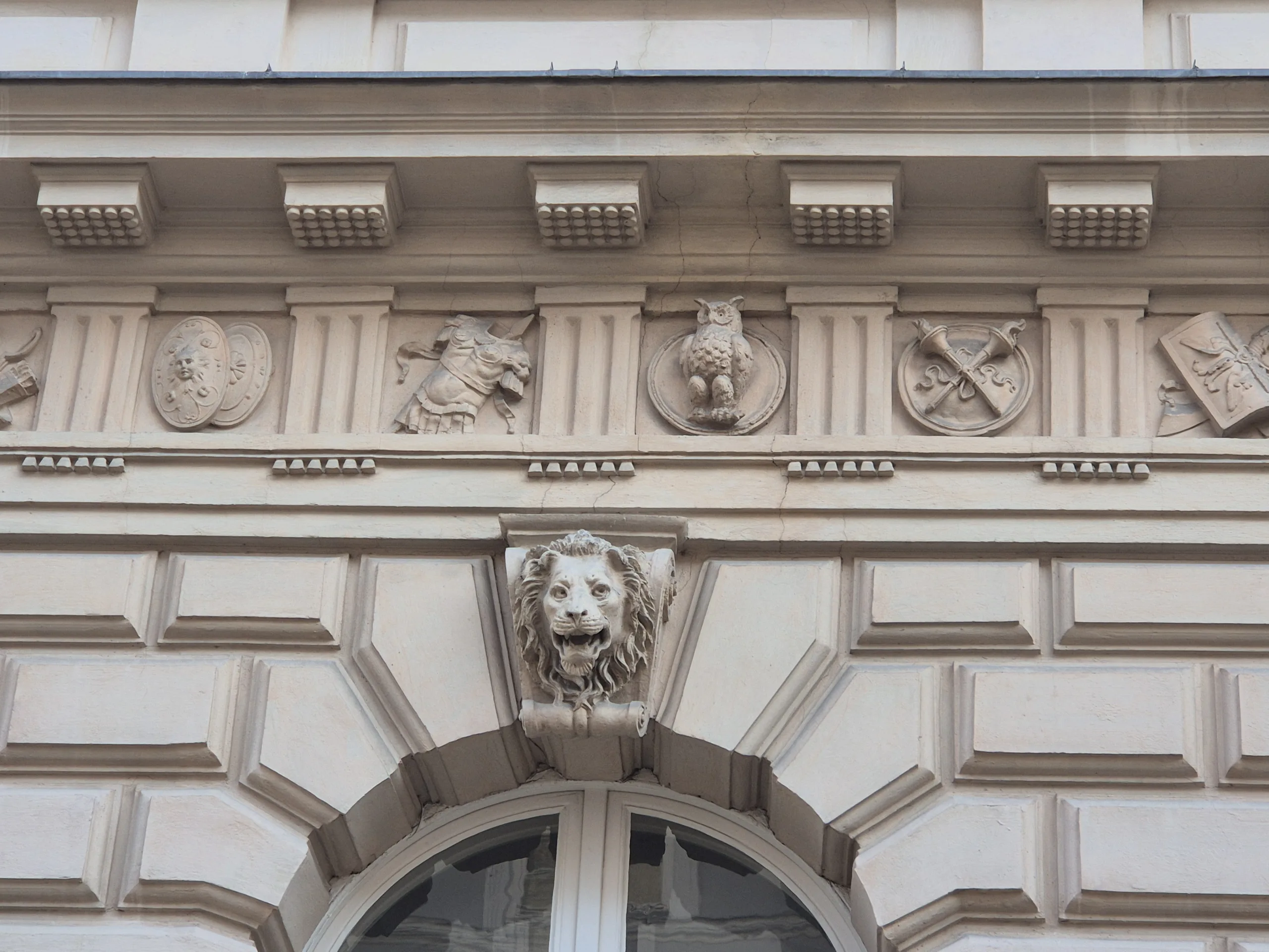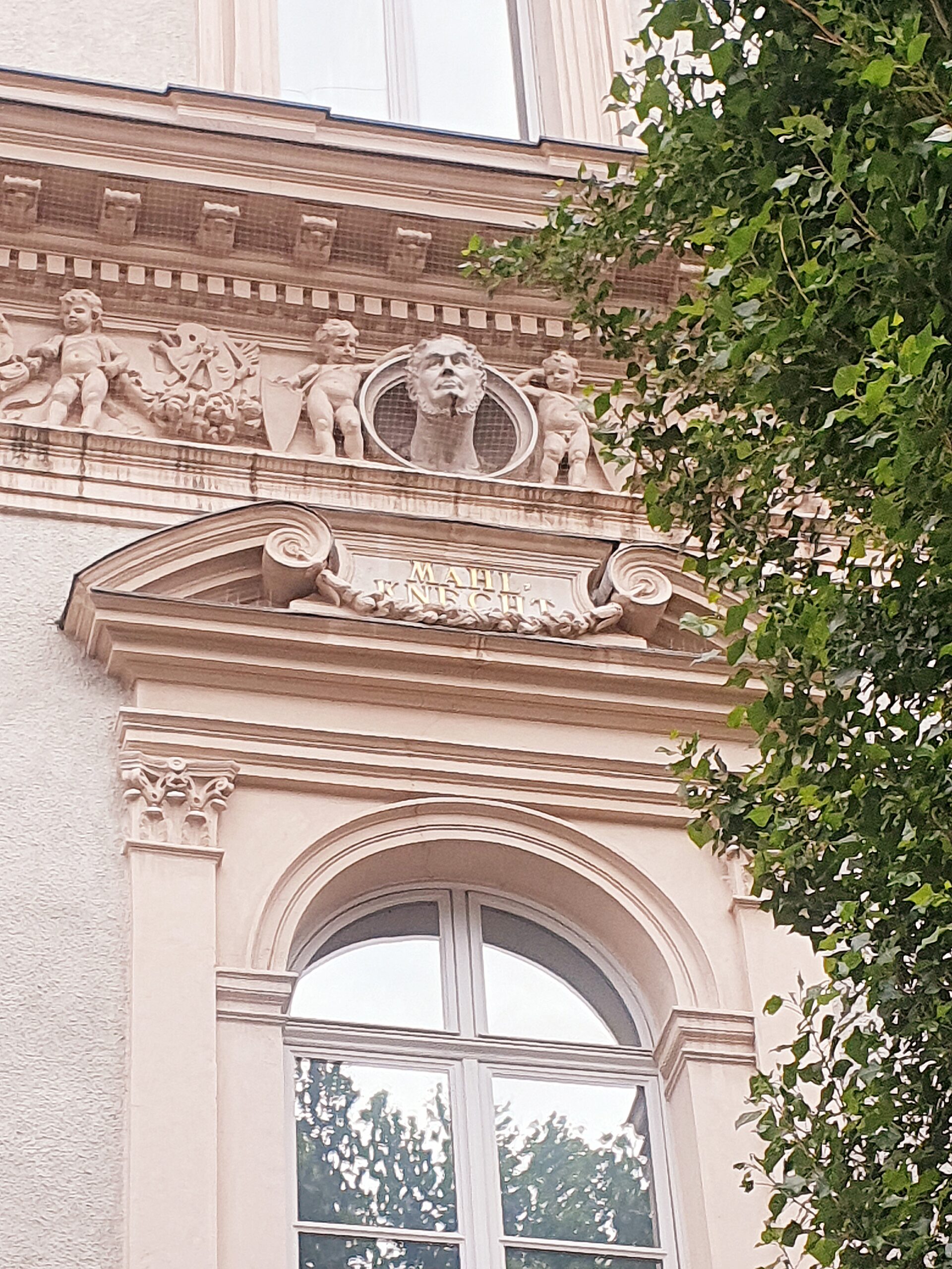 Von dort aus betrachtete ich das Gebäude neu. Über den Fenstern, auf Augenhöhe kaum wahrnehmbar, recken sich Köpfe mit auffallend langen Hälsen nach vorne. Sie sitzen in regelmäßigem Rhythmus oberhalb der Fensterachsen an der Südfassade des Museums. Zwei Geschossreihen sind damit besetzt. Vom Boden aus lassen sich diese Büsten nur schwer erfassen; mehr schlecht als recht versuchte ich, sie mit der Kamera festzuhalten. Doch gerade dieses mühsame Erfassen verlangsamte den Blick – und schärfte ihn zugleich.