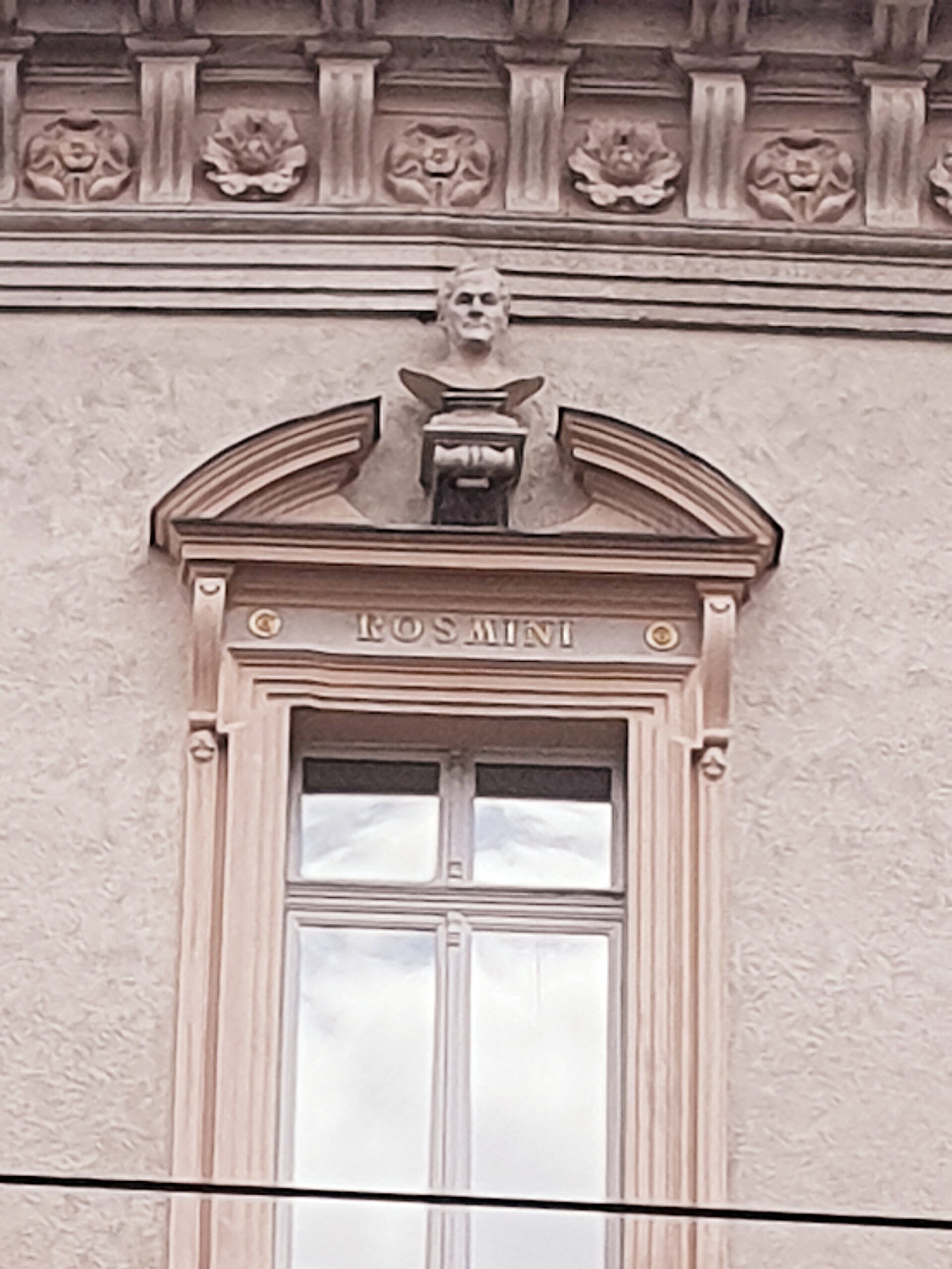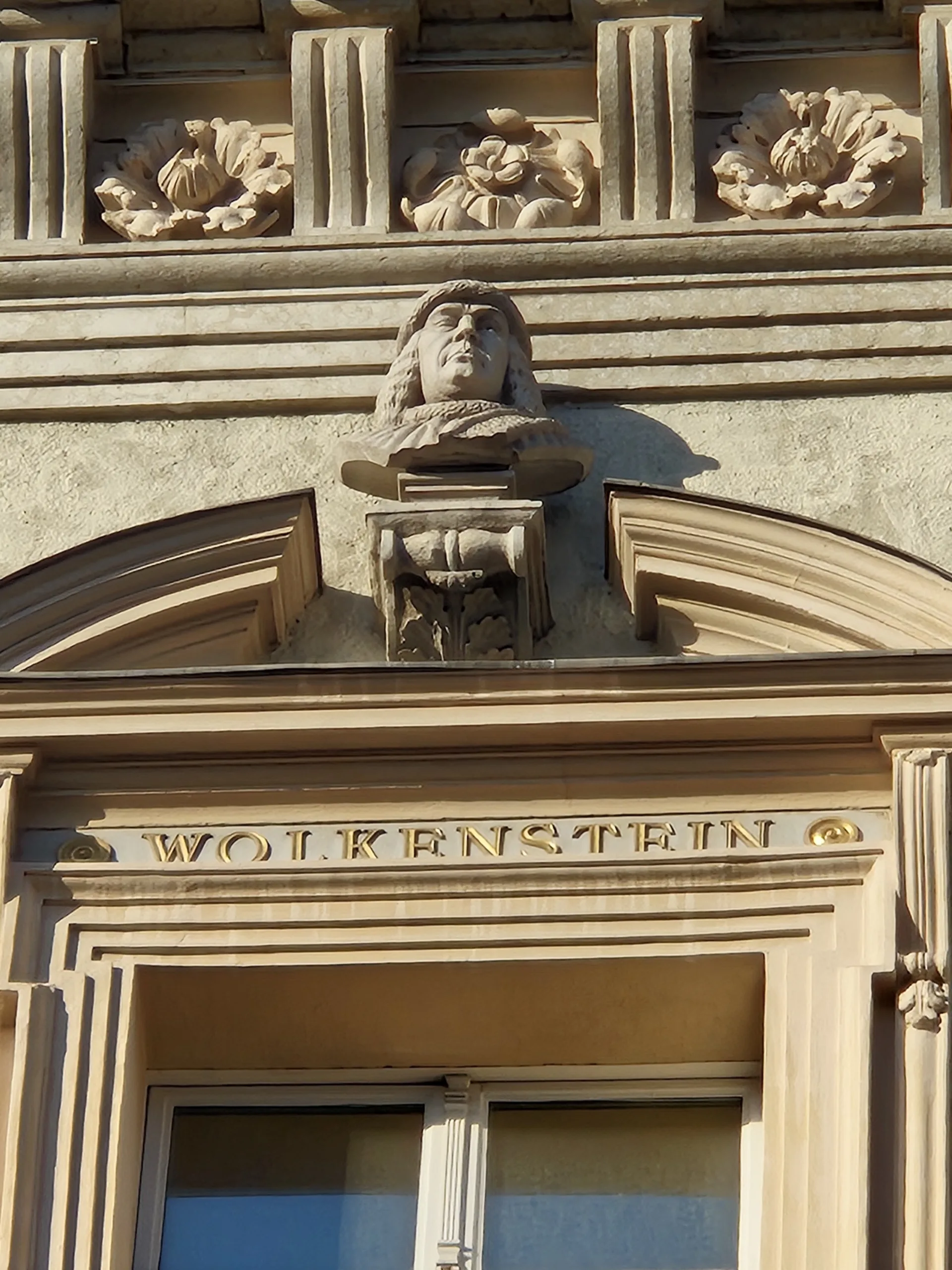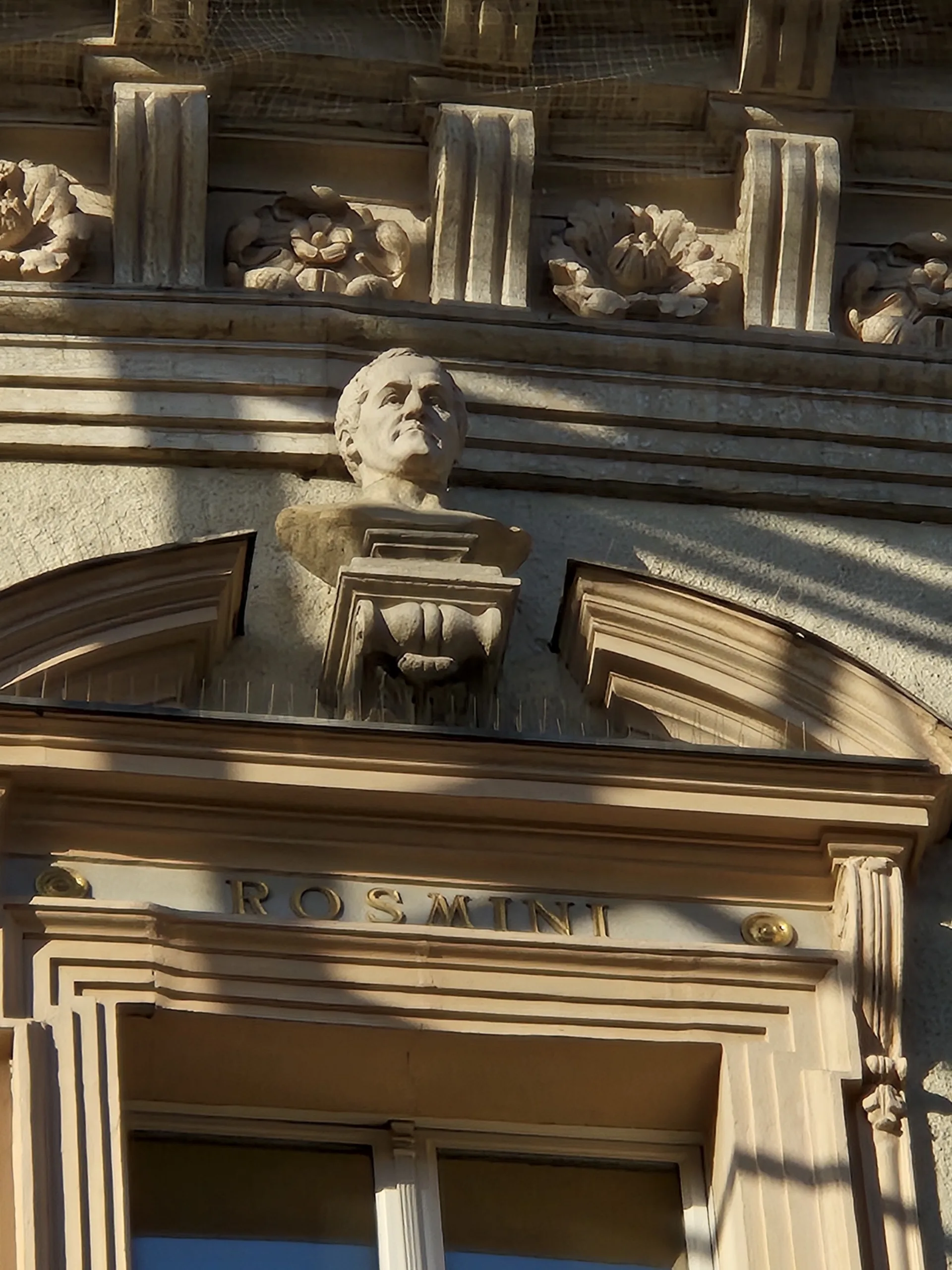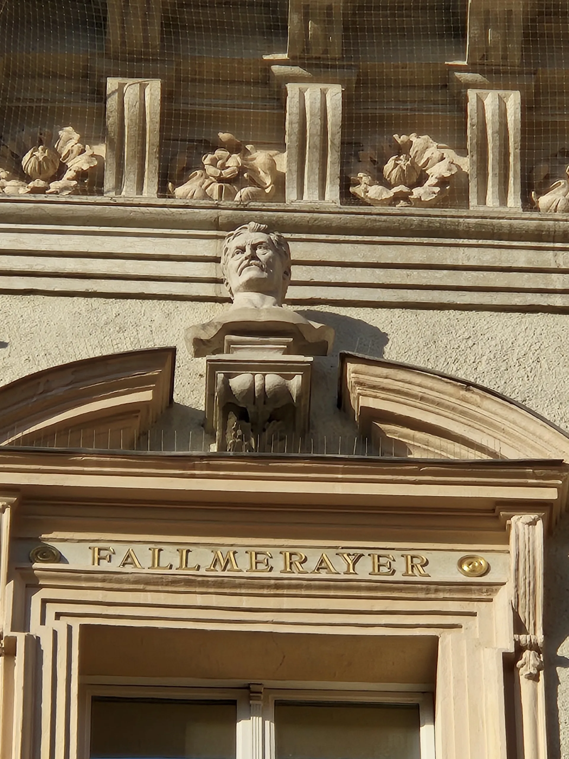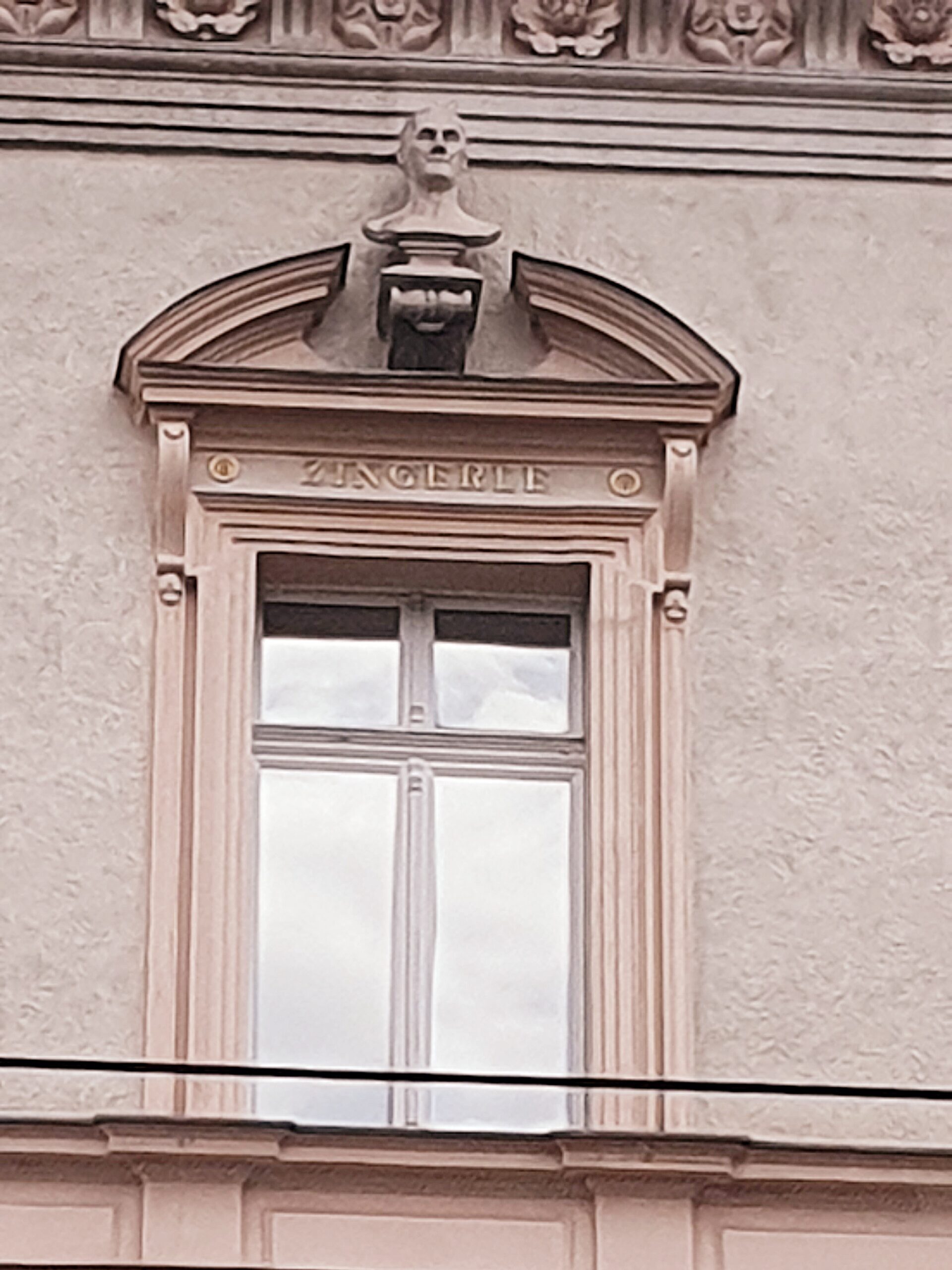 Sie sind oberhalb der Fenster des zweiten Obergeschosses positioniert und verlangen ein noch bewussteres Hinsehen. Hier finden sich Oswald von Wolkenstein, Dichter und Musiker, Hieronymus Tartarotti, Geschichtsforscher, sowie Joseph Resch, Historiker und Theaterdichter. Es folgen Johann Anton Scopoli, Arzt und Naturforscher, der Kartograph Peter Anich, der Historiker und Reiseschriftsteller Jakob Philipp Fallmerayer, der Sprach- und Geschichtsforscher Joseph Bergmann, der Philosoph Anton von Rosmini, der Theologe Pius Zingerle – und schließlich Hermann von Gilm zu Rosenegg, dessen Name mich ursprünglich hierhergeführt hatte.