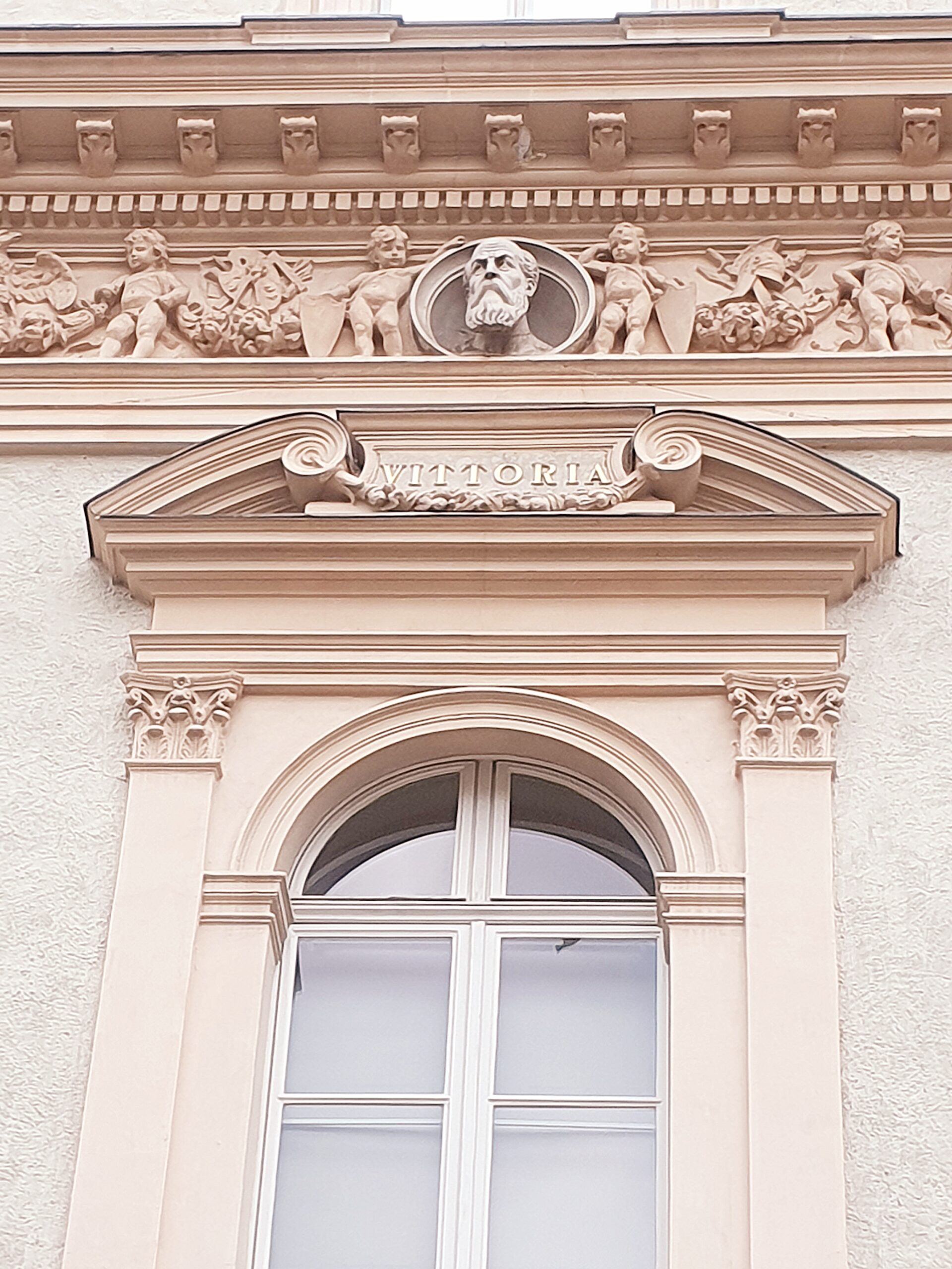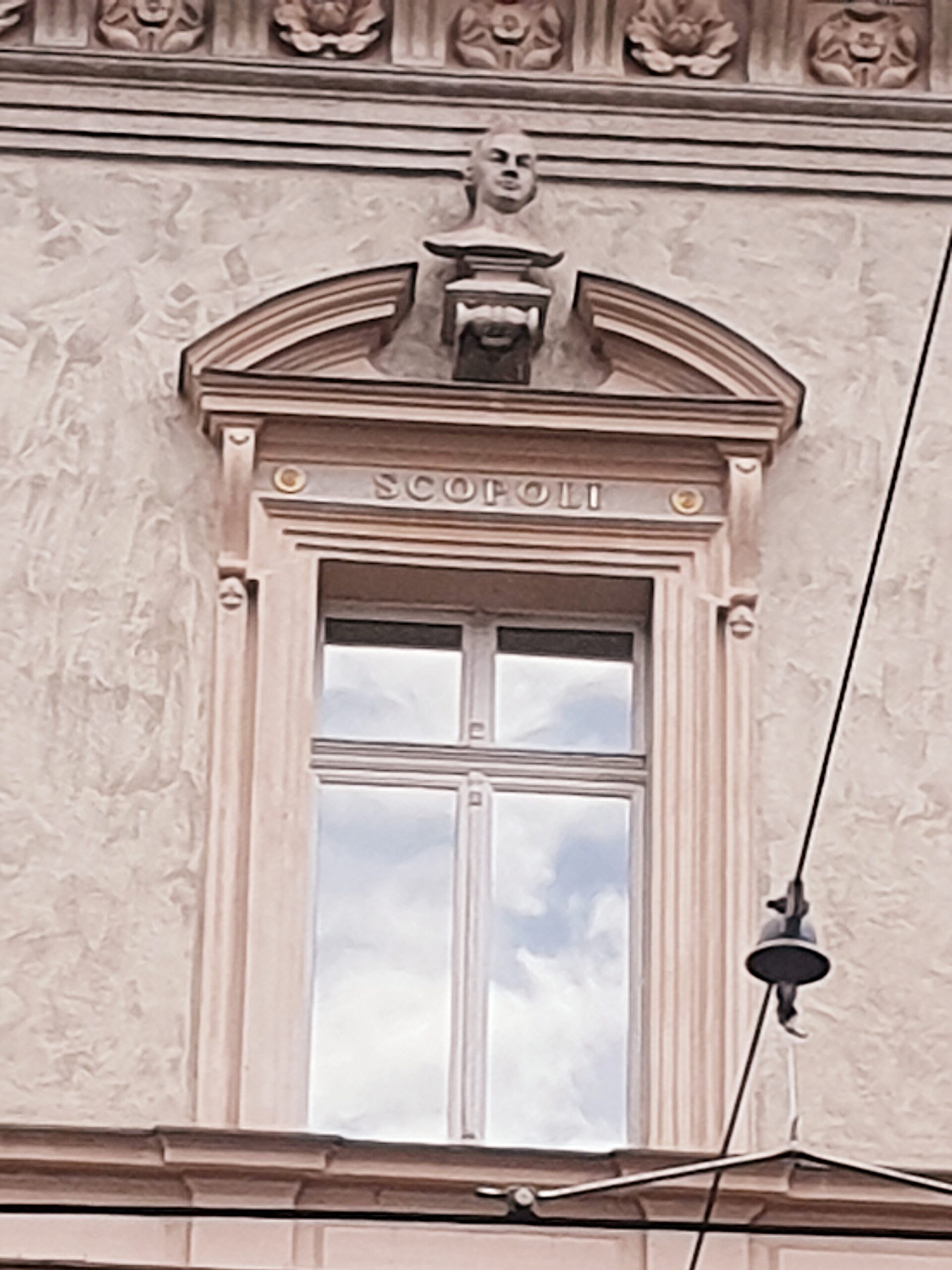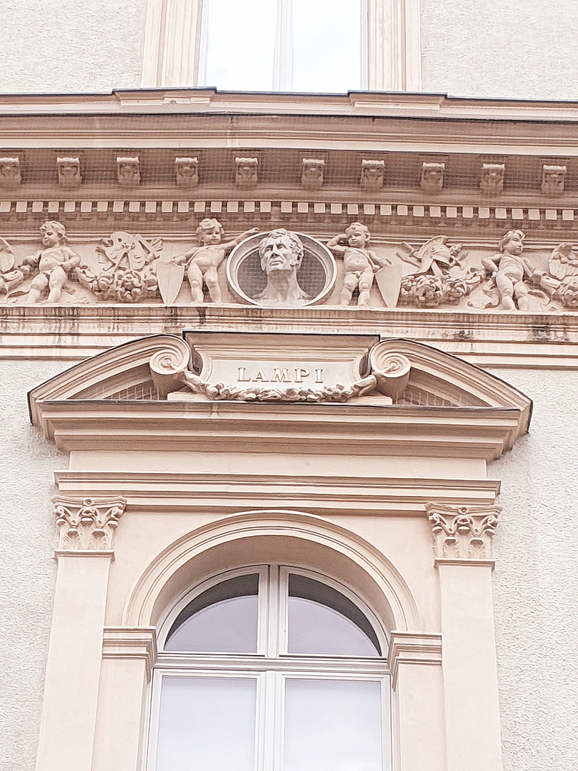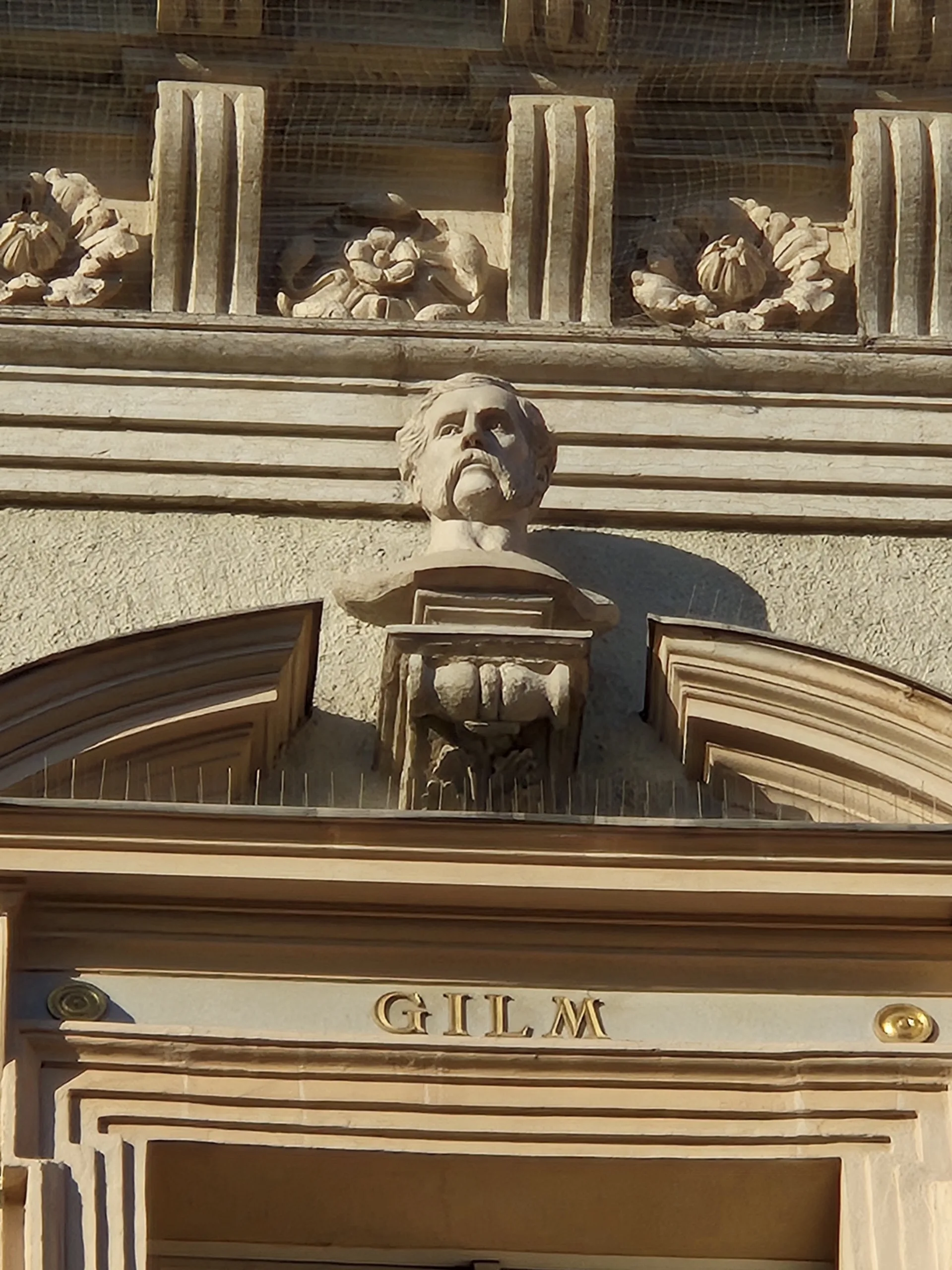 Sie sind oberhalb der Fenster des zweiten Obergeschosses positioniert und verlangen ein noch bewussteres Hinsehen. Hier finden sich Oswald von Wolkenstein, Dichter und Musiker, Hieronymus Tartarotti, Geschichtsforscher, sowie Joseph Resch, Historiker und Theaterdichter. Es folgen Johann Anton Scopoli, Arzt und Naturforscher, der Kartograph Peter Anich, der Historiker und Reiseschriftsteller Jakob Philipp Fallmerayer, der Sprach- und Geschichtsforscher Joseph Bergmann, der Philosoph Anton von Rosmini, der Theologe Pius Zingerle – und schließlich Hermann von Gilm zu Rosenegg, dessen Name mich ursprünglich hierhergeführt hatte.