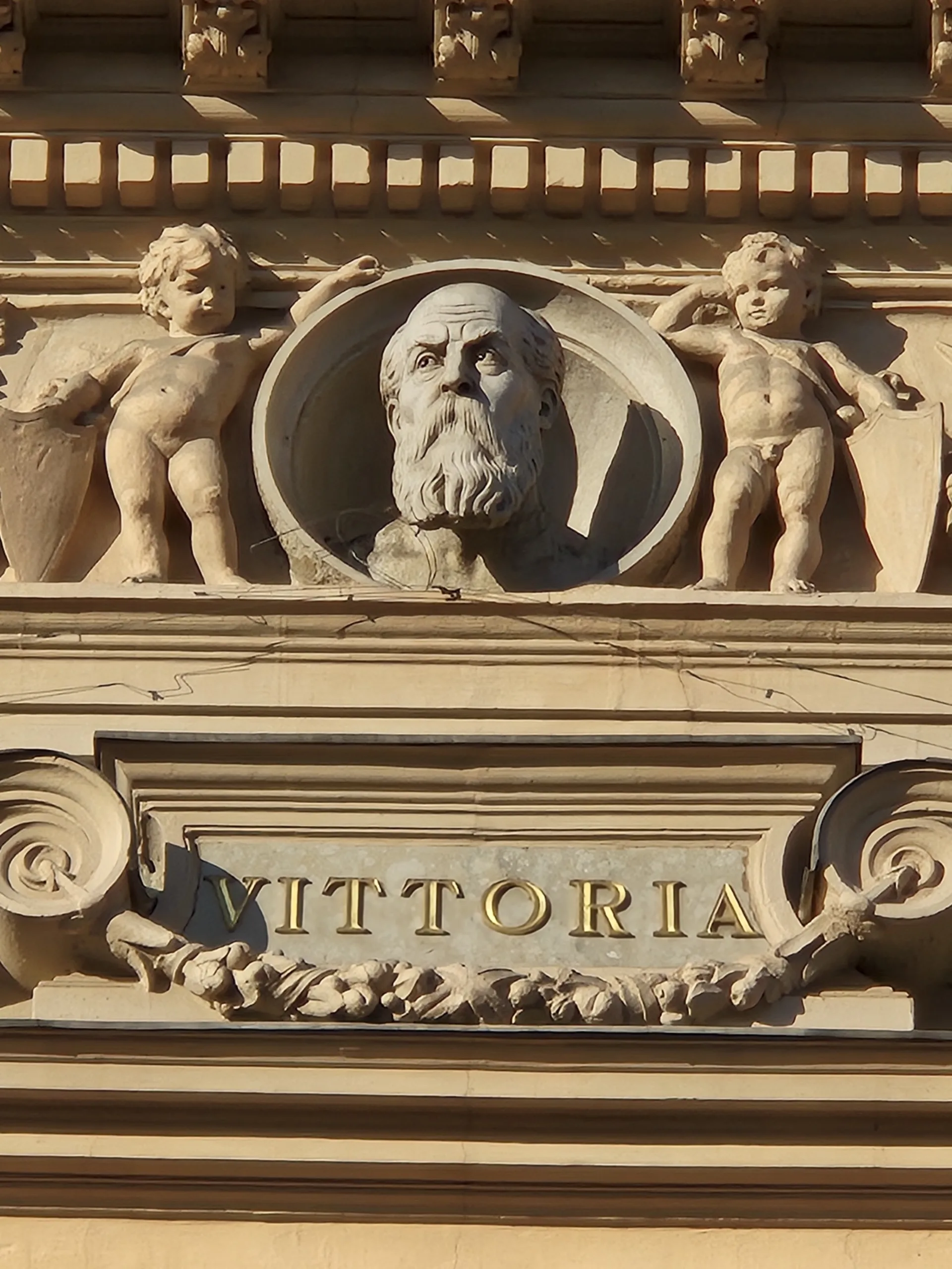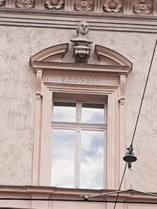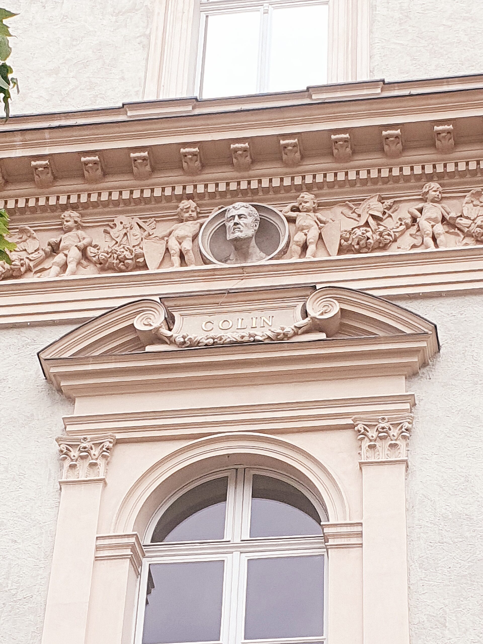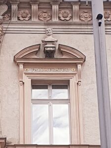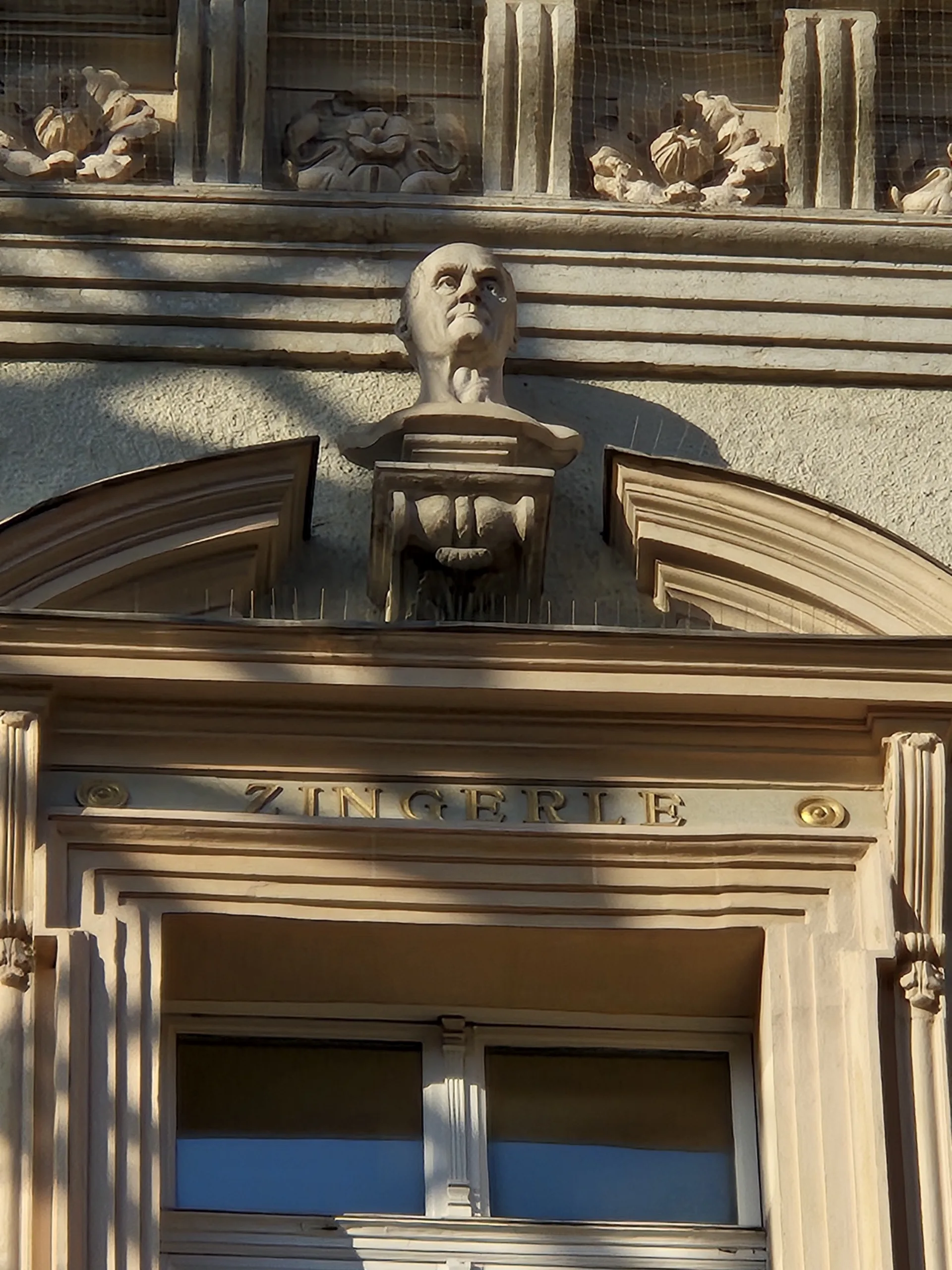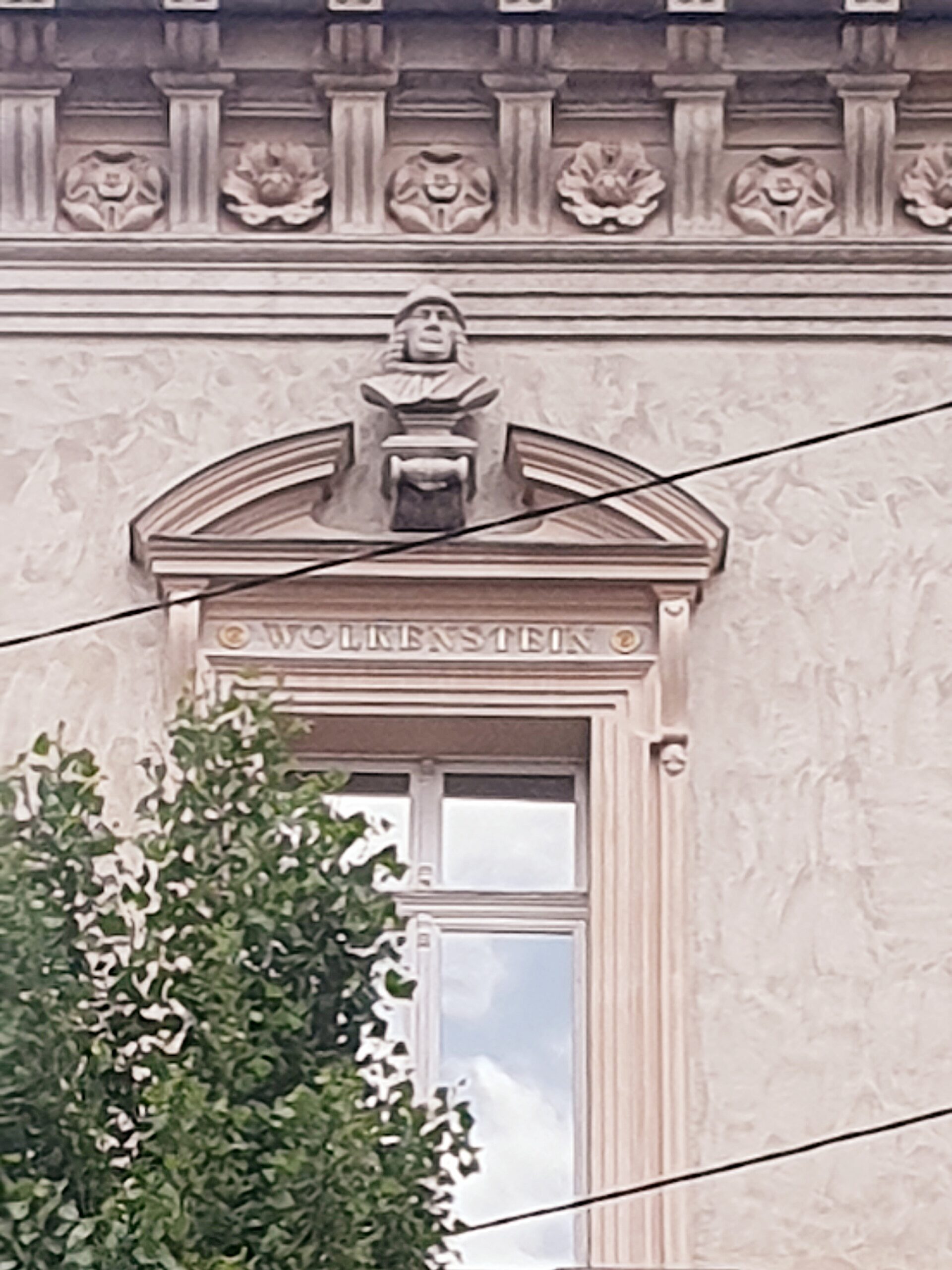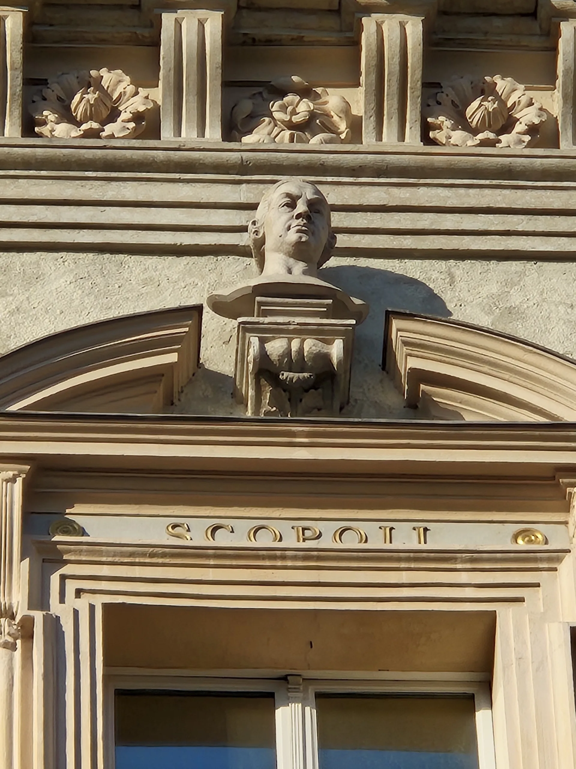 Sie sind oberhalb der Fenster des zweiten Obergeschosses positioniert und verlangen ein noch bewussteres Hinsehen. Hier finden sich Oswald von Wolkenstein, Dichter und Musiker, Hieronymus Tartarotti, Geschichtsforscher, sowie Joseph Resch, Historiker und Theaterdichter. Es folgen Johann Anton Scopoli, Arzt und Naturforscher, der Kartograph Peter Anich, der Historiker und Reiseschriftsteller Jakob Philipp Fallmerayer, der Sprach- und Geschichtsforscher Joseph Bergmann, der Philosoph Anton von Rosmini, der Theologe Pius Zingerle – und schließlich Hermann von Gilm zu Rosenegg, dessen Name mich ursprünglich hierhergeführt hatte.