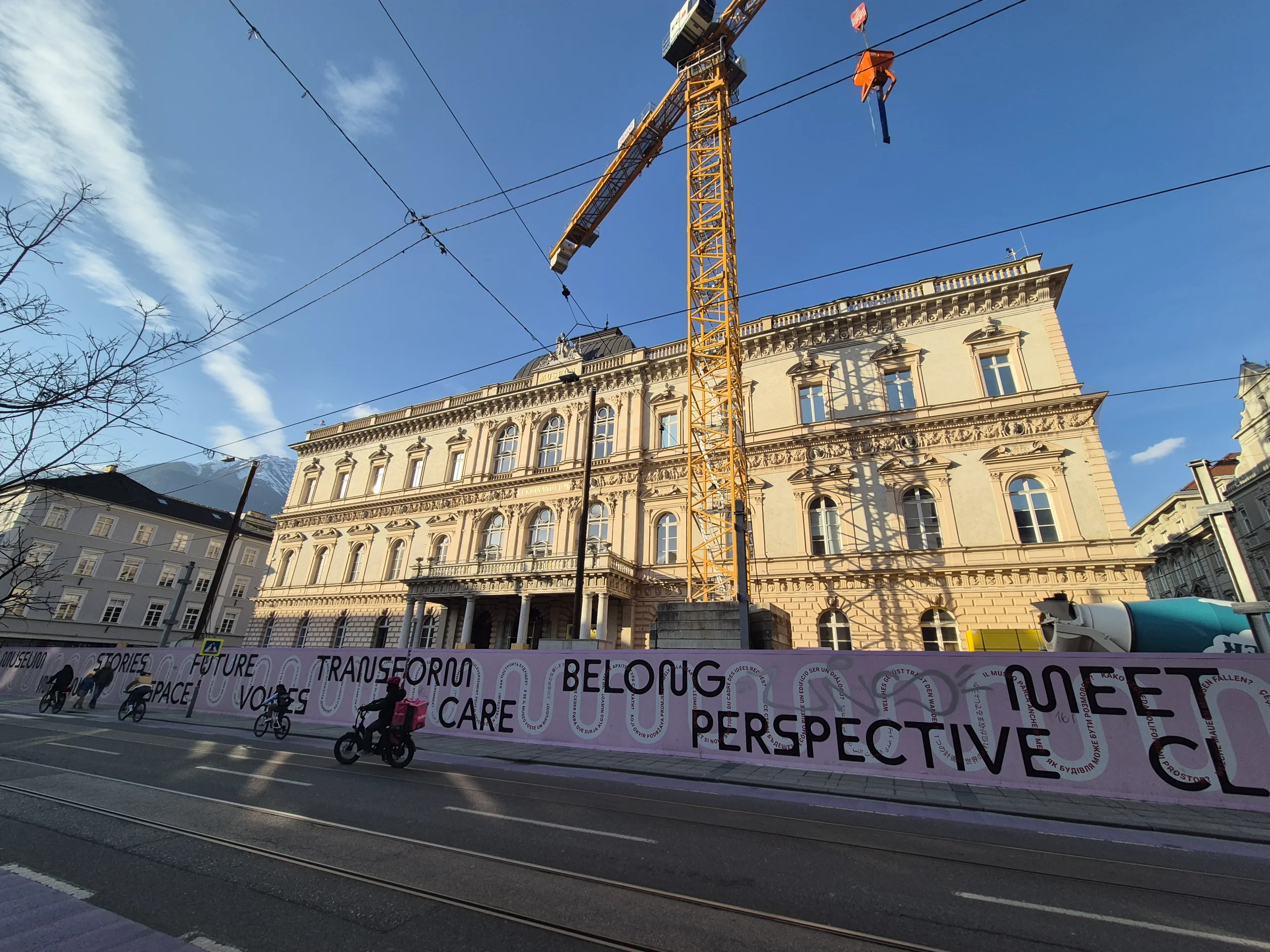Die aktuellen Umbauarbeiten (2024 – 2028) verlegen den Fokus direkt auf die Hülle, denn das Innere samt Kunst ist unzugängliche Baustelle. Ein Bauzaun rahmt das historische Bauwerk ein und kommuniziert mit Schlagworten mit der Außenwelt.